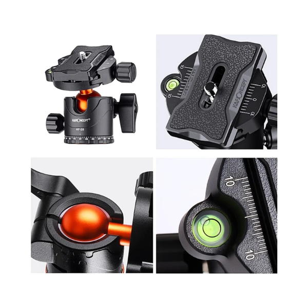 Cabezal de precisión: Rótula de bola con nivel de burbuja integrado para una nivelación exacta.